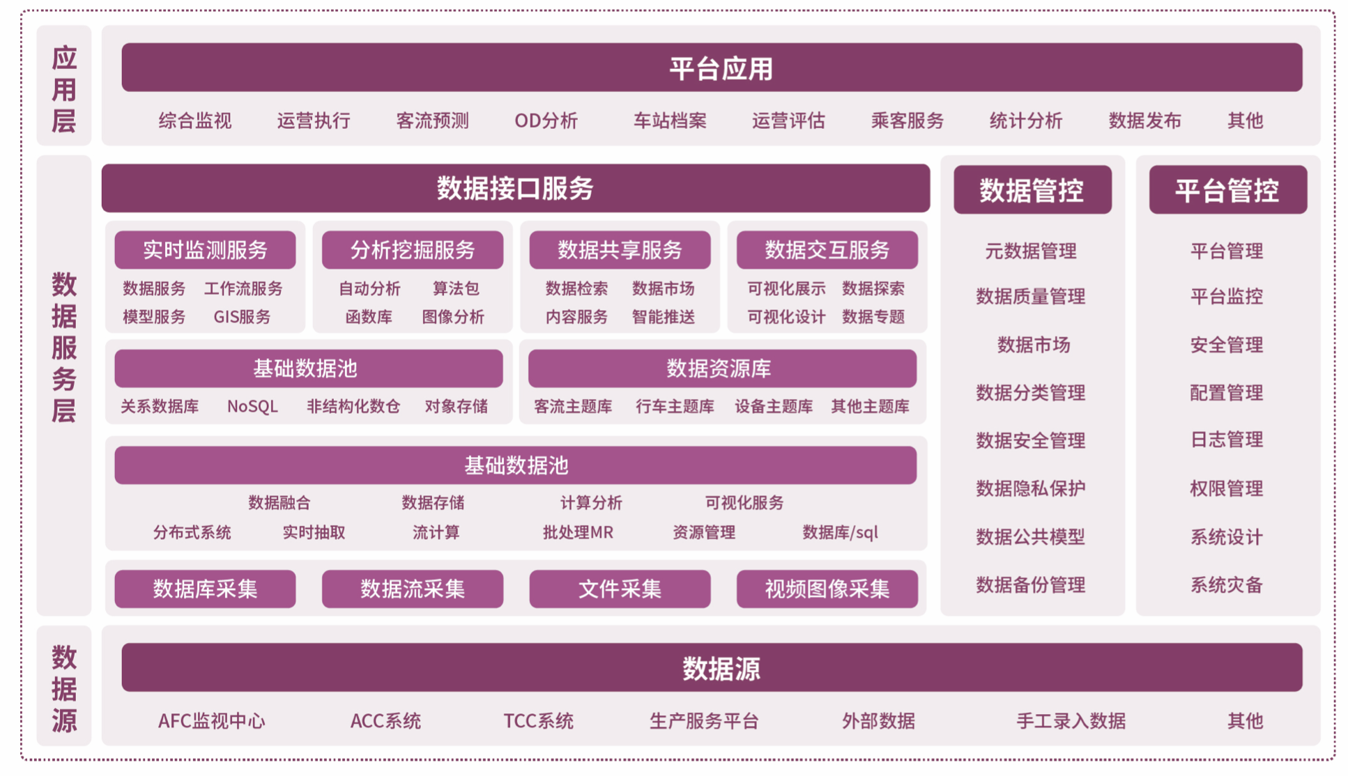 通过本次大数据系统平台和系列业务应用系统项目建设,进一步实现打破数据孤岛壁垒,结合网络化运营管理和决策分析需要,对全路网的基础信息、行车、主要设备、客流、清分清算、票卡、运营维护等数据进行收集、存储,同时根据业务需求构建一套完整的业务指标体系,分析、挖掘数据潜在价值,并将数据分专题地展现到路网结构中,支持指挥中心和运营企业提高网络化运营管理水平、提高乘客服务水平,对网络化运营中突发事件提供应急辅助决策支持、对政府科学决策提供基础信息支持。